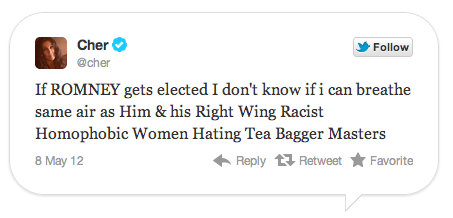 Yes, Cher.  But as much as she’s achieved over the last 50 years, one could argue that Cher’s creative life has probably not been best displayed or utilized in the public arena in the last decade.  She seldom makes films and when she does (“Burlesque”) they’re more campy rather than memorable.  Her records are few and far between; her stage shows are fun but sort of walk-throughs down memory lane.  And yes, at this point of course she’s entitled to have taken some time off from talent, passion or whatever.  However, she hasn’t.  Not really.  What’s publicly moved Cher lately to her greatest effect is being the politically active mother to Chaz Bono  – perhaps one of the most famous members of the gay, lesbian and transgender community.  In the last few years, Cher has taken to Twitter, gaining respect and fame as a plain-talking mother hen spokesperson for the cause.  She has over a million Twitter followers and advocates tirelessly not only for LGBT rights but also on women’s issues – often getting into trouble for tweets like this: