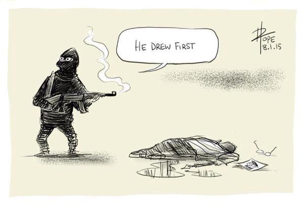 So you can see why I don’t get the outrage over the desecration of a religious leader or even patriotic symbols like, dare I say it, the American flag. Really? Yes. These are ideas, things. Paint a swastika on my door and I’ll be outraged and offended. Continually make AIDS jokes as Eddie Murphy did for a time back in the eighties and I will do my best to never see one of your movies again. But murder and death – really? Are you kidding?