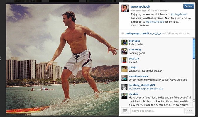 The often shirtless, buff, well-groomed and uber color-coordinated Schock two years ago graced the cover of Men’s Health magazine in a half-naked photo that prominently featured his extremely well-defined six-pack abs. Until recently he was also a relentless poster of selfies via a very public Instagram account that featured him surfing, sky-diving, traveling the world and attending everything from a Katy Perry concert to country club cocktail parties sandwiched in-between countless trips to and images of him working out at the gym. During many of these activities he was not only accompanied by various young staffers but more recently on several international and nationwide trips, photographed alongside a handsome and very hunky young male wedding photographer whose job it was to accompany him and serve as the Congressman’s personal chronicler of all things Aaron.