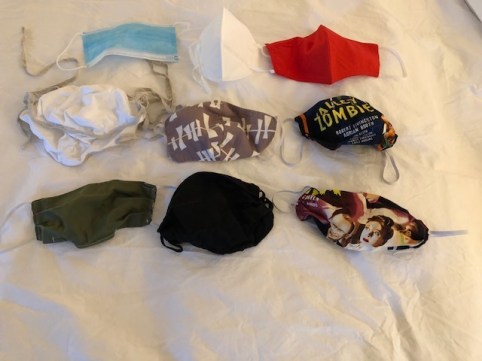 I am also partial to the one emblazoned with part of the title of an old noir movie I never heard of. A friend who makes them and donates the proceeds of the sales for PPE equipment to doctors and nurses sent it to me from the east and, truly, they’re genius – and durable. I’ve washed it 25 times already and it still hasn’t lost its elasticity. (Note: Which is more than I can say for myself these days).