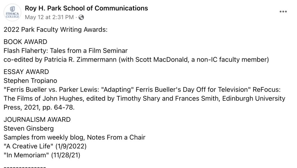 That being said, we couldn’t let this week go past without properly celebrating the Chair for another amazing Notes-related accomplishment. Mr. Chair has received the Journalism Faculty Writing Award from the Roy H. Park School of Communications at Ithaca College for none other than two posts for this very blog! Here’s the announcement: