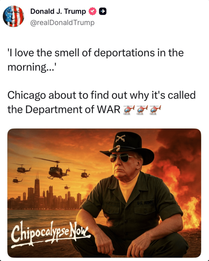 But when, on Saturday, he co-opted Francis Ford Coppola’s Apocalypse Now poster and dialogue to make a joke threat of invading the great American city of Chicago – a town where I went to grad school, lived in briefly in my early twenties, and formed key lasting friendships over more than four decades, he pissed me off.