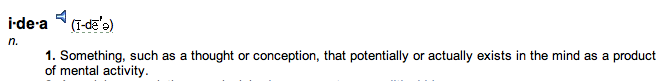 An idea is a seedling, a notion or a thought. It can be inspiring, confusing, derivative, offensive or even just plain odd. But, and this is the biggie, is only an idea. If you look at the dictionary definition of the word, as I love to do in times like these, you will see that an IDEA is defined as: