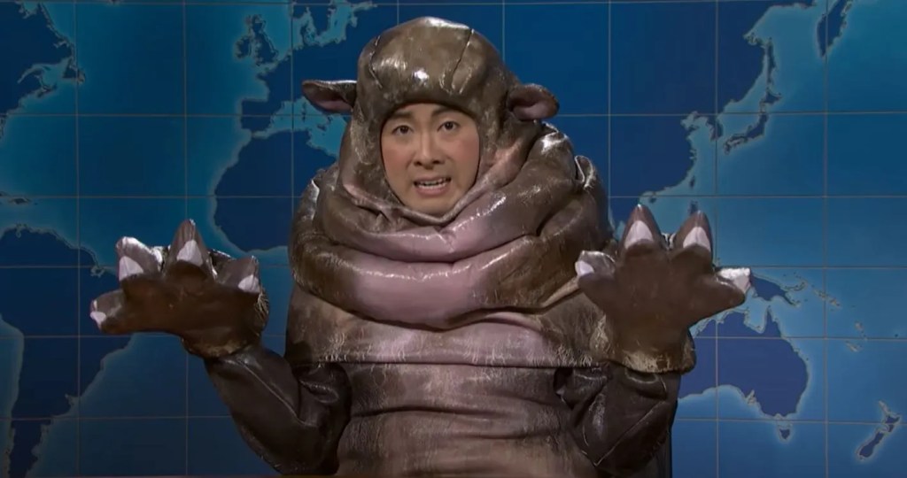 It might not be great for the world but it sure does help provide SNL and shows like it tons of opportunity to land a laugh in the oddest of ways. For example, it’s rare for a Weekend Update segment to in one moment have a set piece where we have commentary from the beleaguered 10-week old world famous baby Chinese hippo Moo Deng (Note: A hilariously costumed Bowen Yang) after just moments before hearing Jost remark that TikTok voters are using AI to translate Hitler speeches into English, whereupon he plays an actual short clip from a real post that shows the real Hitler ranting but has us hearing the actual debate voice of Trump claiming (about Haitians):