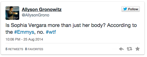 That is not the way many of the women close to me, or the tens of thousands of other people on Twitter and various alternative platforms and devices, viewed it, however. Charges of TV Academy sexism quickly abounded, celebs like Katie Couric voiced their disapproval, and pundits much more powerful and wider read than myself posted think pieces and visual aids about feminist representation. Most also mentioned the irony that some moments after Ms. Vergara exited, Julianna Marguiles accepted a best actress Emmy in a speech that boasted how we are currently living in a “golden age of television ” in terms of roles for women.