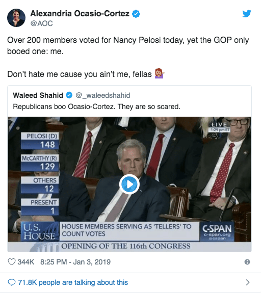And seriously, Congressmen, you’re going to actually BOO Congresswoman Ocasio-Cortez and no one else when she cast her vote for Nancy Pelosi to be Speaker of the House? And then say they were just playful boos? What are you, eleven? Are you playing kickball? If you have a secret crush on her, why not playfully just go up to her and punch her in the arm? Right, you can’t do that anymore in the age of #MeToo. Then just speak to her privately and tell her you like her, despite everything. No touching, though.